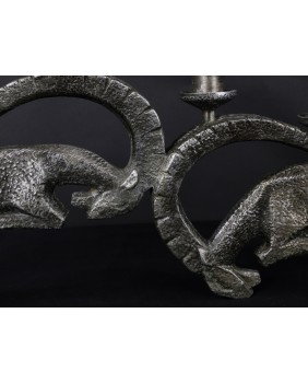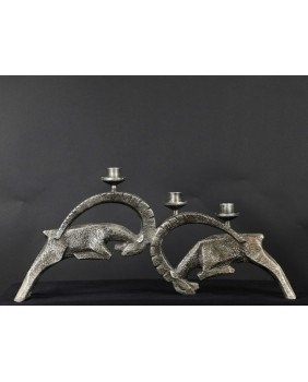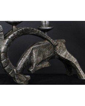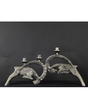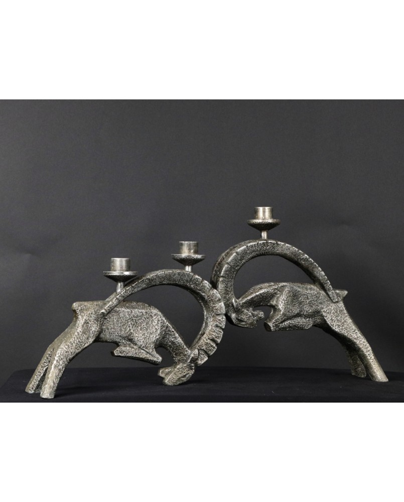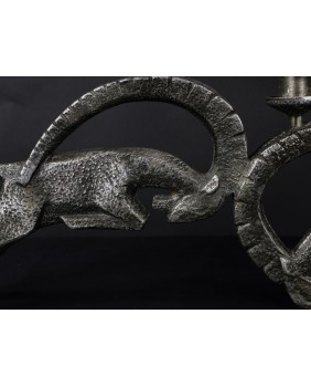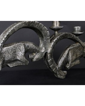 Świecznik wykonany jest z białego metalu. Racze nie jest to aluminium bo jest zbyt ciężki. Jest w dobrym stanie wymaga jedynie drobnej kosmetyki, która uwypukli jeszcze interesującą fakturę rzeźby. Świecznik ma 27 cm wysokości i 56 cm szerokości. Rozstaw nóg walczących kozłów ma 7 cm.