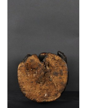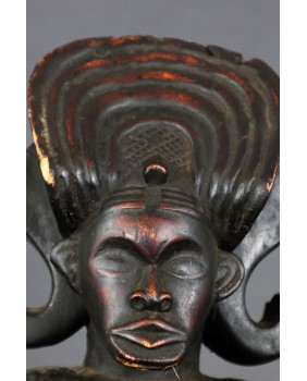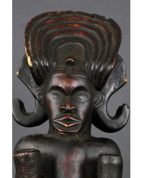 Figura ma ładną patynę. Znalazłem informację, że powstaje ona poprzez konserwację rzeźby olejem palmowym. W dolnej części twarzy jest szczelina, w której mocowana była broda wykonana z włosia. Broda podkreślała królewską powagę. Nie zachowała się niestety. Rzeźba jest w dobrym stanie. Pęknięcia są wynikiem wieku, który określiłbym na początek drugiej połowy XX wieku. Ma 45 cm wysokości, 16 cm szerokości i 15 cm głębokości. Polecam.