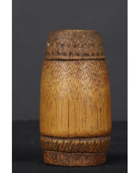 Nie jest to może najbardziej okazały przykład sztuki plemiennej Atoni. Może to świadczyć o użytkowym charakterze przedmiotu, jego realnym stosowaniu w codziennym życiu. Wśród mniej zamożnej części społeczności Atoni. Jedynym motywem ozdobnym pojemnika oprócz pięknie wykorzystanej struktury łodygi bambusa jest motyw Kaif, wzór składający z kresek, rombów i kropek bardzo charakterystyczny dla tej kultury. Pojemnik ma szczelną pokrywę a wewnątrz są ślady po jakimś proszku. Ma 11 cm wysokości i 6 cm szerokości.