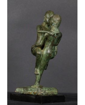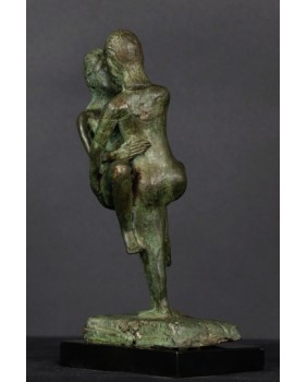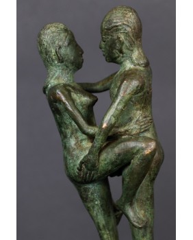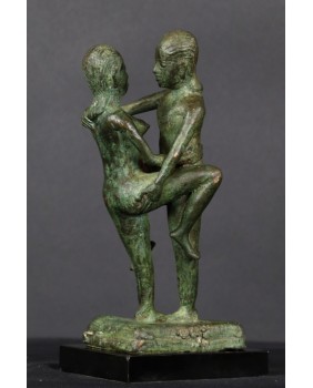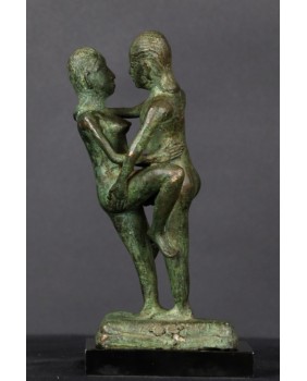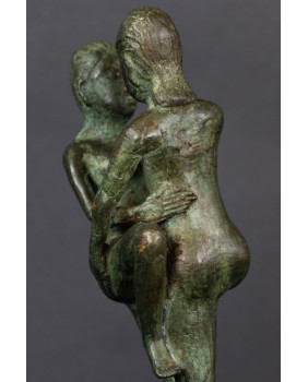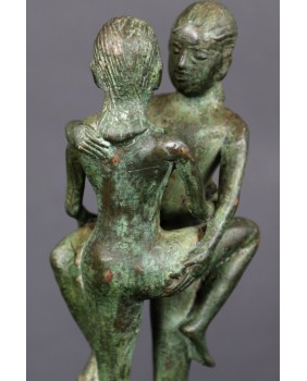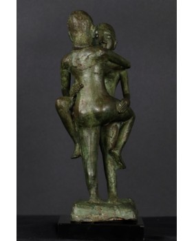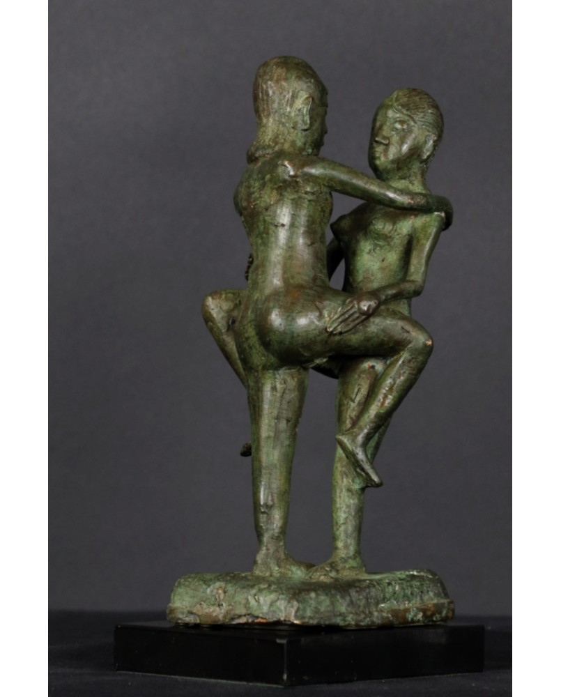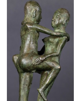 Jeśli chodzi o rzeźby w brązie to są w moim przekonaniu dużo oszczędniejsze. Pomijam oczywiście, figurki erotyczne tworzone seryjnie dla turystów. Rzeźba, którą oferuję przedstawia kobietę i mężczyznę stojących w erotycznej pozie, zespolonych biodrami, wpatrujących się w siebie, jak można przypuszczać z miłością. Artysta bardziej pozwala pracować naszej wyobraźni niż dokumentuje akt miłosny. Patrząc na tę rzeźbę możemy, a przynajmniej ja mogę, odczuć emocjonalne napięcie miedzy tą parą.