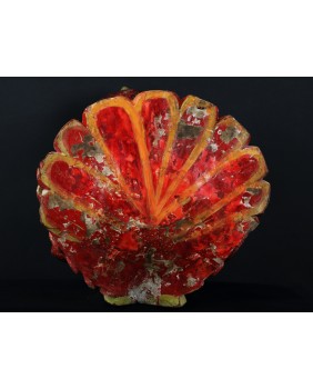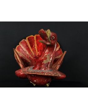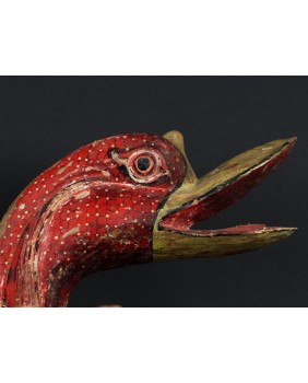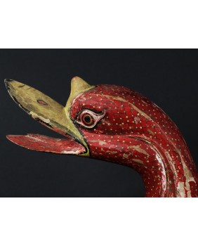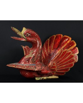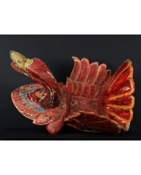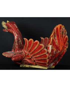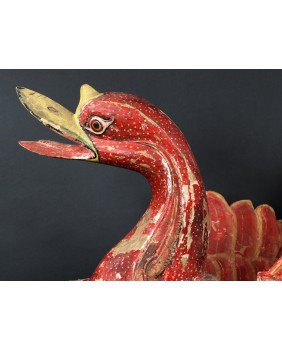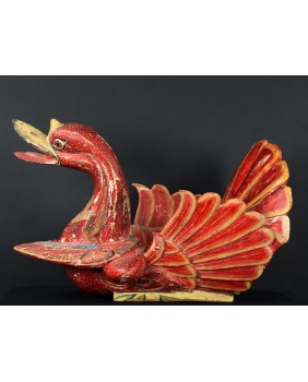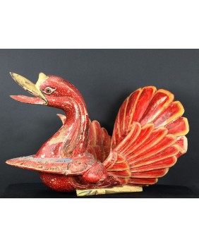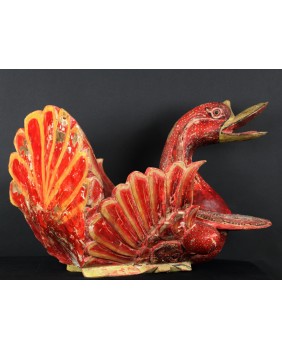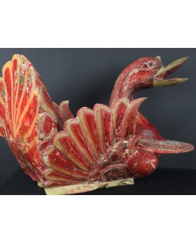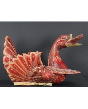 Rzeźba, którą oferuję pochodzi z Chin. Jest stara była bowiem kilkukrotnie przemalowana. Usuwałem kilka warstw farby przy czym trzeba dodać, że kolejne malatury, starały się w sposób mniej lub bardziej udany naśladować oryginalny wersję. Widocznie rzeźba była dla kogoś ważna i istotna. Niedużej naprawy wymagał również ogon ptaka. Sądzę, że rzeźba miała charakter użytkowy. Być może w pojemniku, który tworzą ogon i skrzydła składano ofiary. Zagadką są stożkowe wypustki po bokach ptaka. Anatomia gęsi czy też łabędzia w niczym ich nie uzasadnia, tym bardziej, że rzeźba bardzo realistycznie oddaje sylwetkę ptaka.
