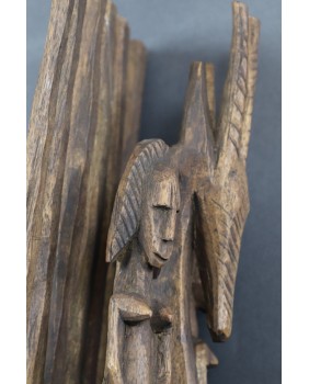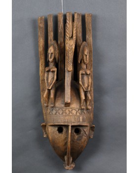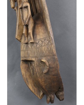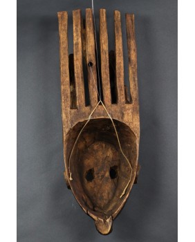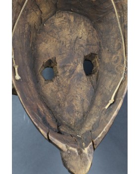 Maska jest w dobrym stanie, niewielką starą naprawę widać jedynie w okolicy dolnej szczęki. Myślę, że ma kilkadziesiąt lat. Drewno jest spatynowane w naturalny sposób. Nikt nigdy nie starał się sztucznie dodać jej lat. Ma 58 cm wysokości, 20 cm szerokości i 12 cm głębokości.
