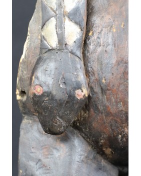 Sądzę, że maska jest stara. Pochodzi z połowy XX wieku. Ma wiele napraw, niektóre wykonane bardzo profesjonalnie, inne w sposób prymitywny. Nie potrafię wytłumaczyć obecności węża. Podobną maskę z wężem zjadającym żabę spotkałem opisaną jako należącą do Gelde, plemienia będącego częścią społeczności Yoruba. Jednak zdecydowana większość masek ciążowych przypisywana jest społeczności Makonde.