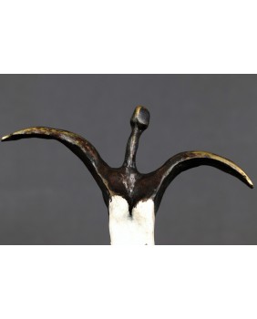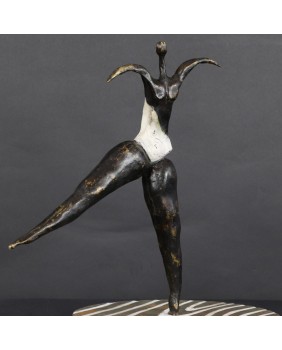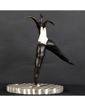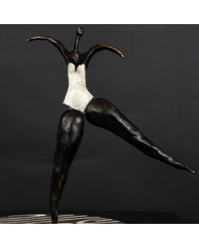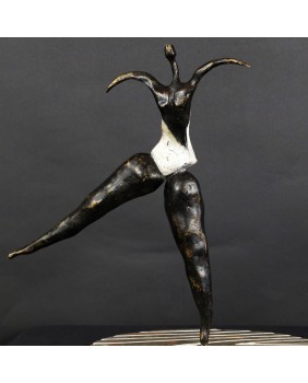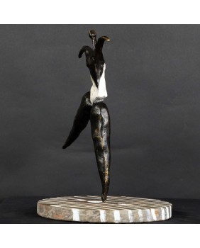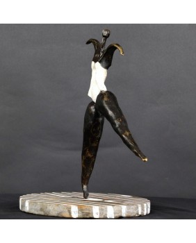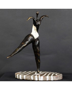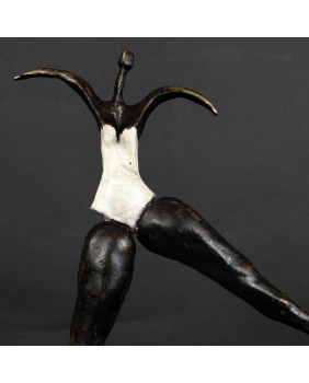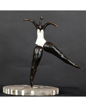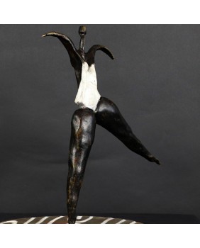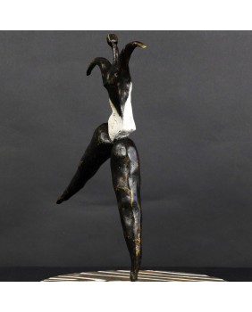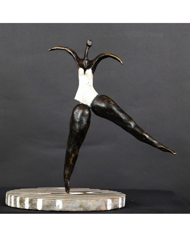 To kolejna postać baletnicy w mojej ofercie. Ta rzeźba kojarzy mi się, podobnie jak wielu osobom, które ją oglądały, z twórczością Niki de Saint Phalle. Może to z powodu pop-artowskiego sposobu malowania podstawy, może poprzez biały kostium baleriny. Mimo, że na pierwszy rzut oka jest dużo lżejsza od rzeźb tej artystki to charakteryzuje ją podobna budowa postaci, składającej się z kilku zwężających się wałków brązu.