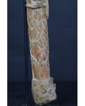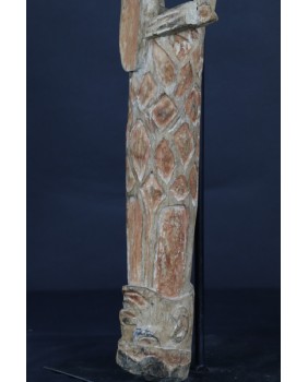 Rzeźbę kupiłem na Kole w Warszawie, gdzie przywędrowała ze Szwecji. Ma 78 cm wysokości, 13 cm szerokości i 10 cm głębokości. Podstawa stojaka ma wymiar 20 na 20 cm. Cena obejmuje metalowy stojak, jeżeli jednak nie jest potrzebny od ceny można odliczyć 50 zł.