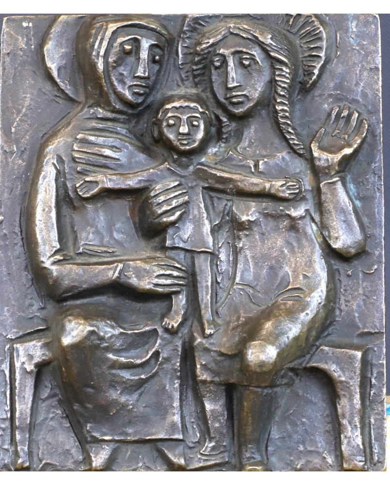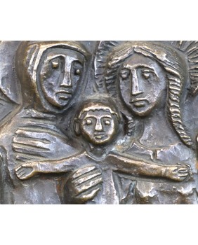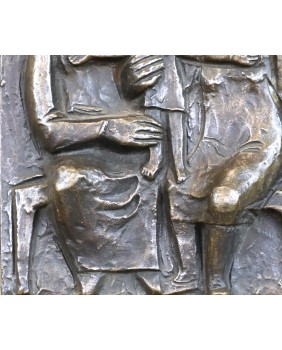 Urzekły mnie w tej płaskorzeźbie prostota i surowość ukazania świętej rodziny. Natychmiast przypominają mi się romańskie rzeźby i obrazy. Żeby była jasność: w żaden sposób nie porównuję tej plakiety do sztuki romańskiej. Po prostu takie mam skojarzenia. Może z powodu podobnej jak w okresie romańskim hieratyczności w sposobie przedstawienia postaci.
