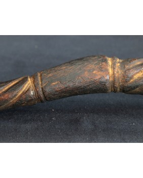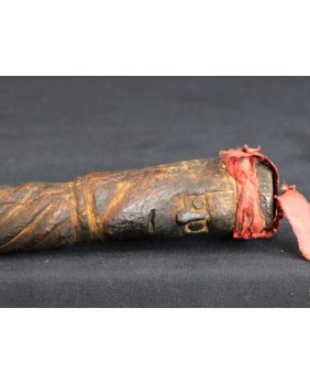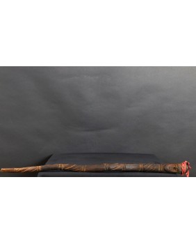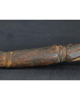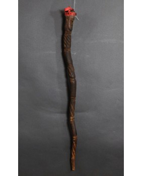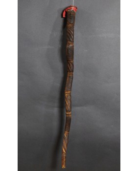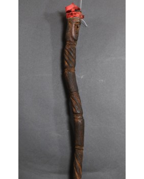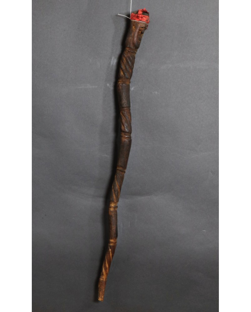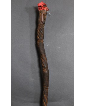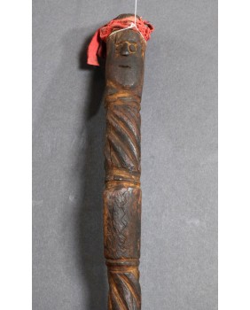 Laskę kupiłem z kilkoma innymi przedmiotami sztuki plemiennej pochodzącymi z Oceanii. Większość z nich dała się łatwo zidentyfikować jako stworzone przez społeczność Dayaków. Pochodziły głównie z Borneo i Timoru. Było tam też kilka lasek. Szukając ich proweniencji odkryłem laski Tun Tun, używane przez Dayaków. Nazywane czasami „świnkami”. Najczęściej zwieńczenie laski zdobi postać człowieka siedzącego w pozycji kucznej. Jest wyobrażeniem przodka a ściślej mówiąc ducha przodka. Dużo rzadziej laskę zdobi sama twarz lub dwie przeciwstawnie umieszczone jak to ma miejsce w przypadku tej laski.