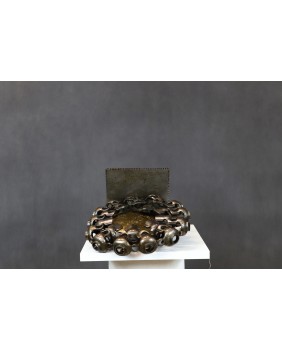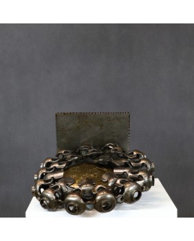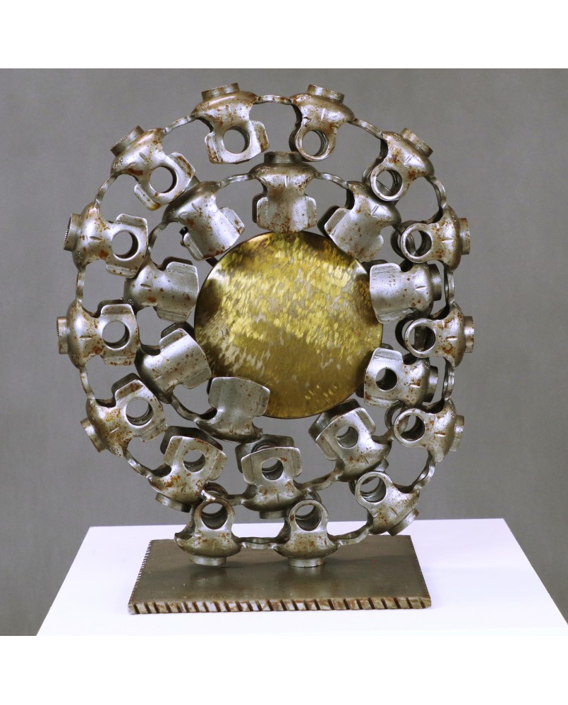 Oferowany zegar należy do przeciwstawnego nurtu jego twórczości. Metalowych instalacji odnoszących się do problemów współczesnego świata. Jest wykonany ze stali z wykorzystaniem autentycznych części maszyn. Ma średnicę około 30 cm. Podstawę stanowi kwadrat o boku 17cm. Rzeźba nie jest sygnowana ale mam potwierdzenie autorstwa na fakturze i nie ma żadnego powodu aby sprzedawcy nie wierzyć.