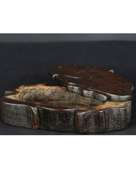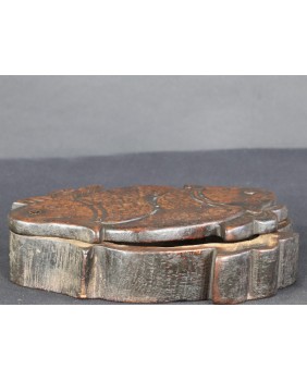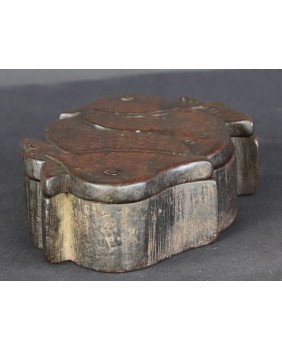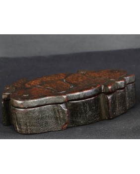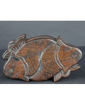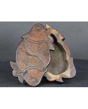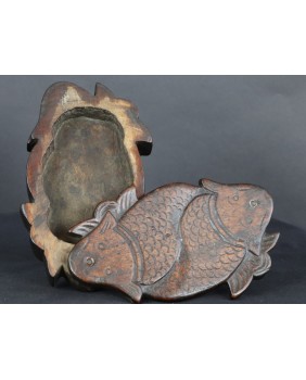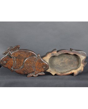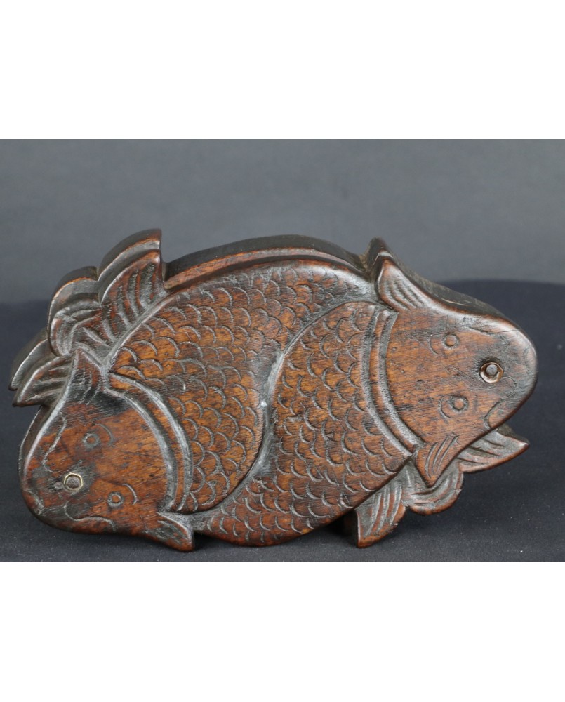 Według sprzedawcy pudełko pochodzi z Korei i datował je na co najmniej XIX wiek. Nie wątpię w żadną z tych informacji choć nigdzie nie znalazłem podobnego. Potwierdza to po części stylistyka starych koreańskich mebli i szkatułek, pozbawionych przesadnych ozdób i malatury, stawiających na eksponowanie faktury drewna. Oczywiście pudełko nie należy do kręgu sztuki dworskiej. Jest prowincjonalne, zbliżone do sztuki popularnej. Rzeźba na obrotowym wieku przedstawia zapewne ryby Koi. Ozdobne karpie, których hodowla była popularna w Chinach, Japonii, Korei i Wietnamie.
