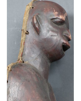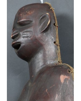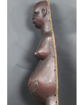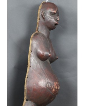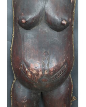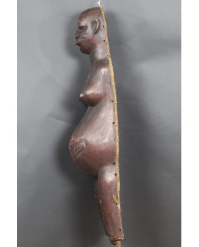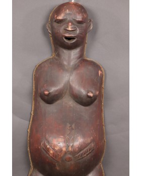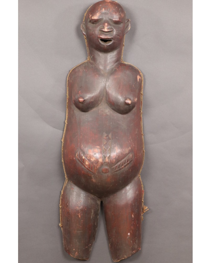 Okazuje się, że ciążowe maski Makonde występują w trzech różnych odmianach. Pierwsza, najbardziej popularna, przedstawia ciążowy brzuch i biust kobiety. Nasępnie jest komplet czyli maska na brzuch i maska na twarz, które wraz z kostiumem tworzą zestaw amwalindembo. I wreszcie najrzadsze i tę maskę oferuję, gdzie część twarzowa i tors kobiety wyrzeźbione są łącznie.