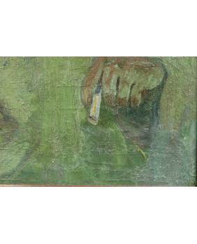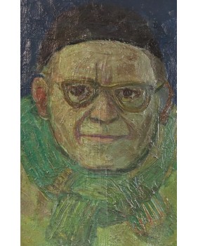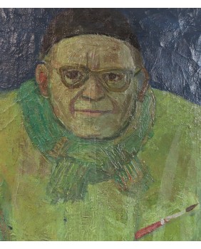 Obraz urzekł mnie prostotą ujęcia tematu, kolorystyką, spojrzeniem oczu zza grubych okularów. Spojrzeniem pogodnego zadowolonego z siebie człowieka, spełnionego artysty. Bo nie mam wątpliwości, że jest to autoportret malarza. Sądzę, że powstał w latach sześćdziesiątych. Zresztą sprzedawca sugerował taką datę zakupu.