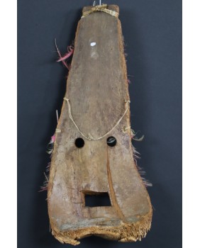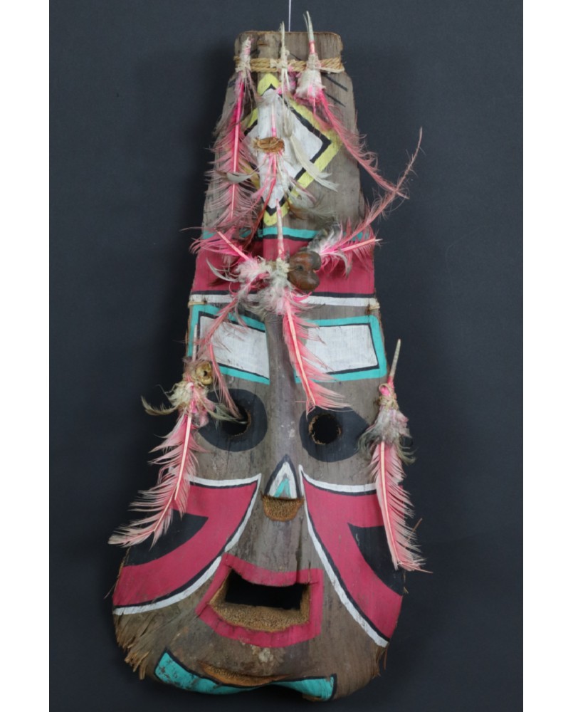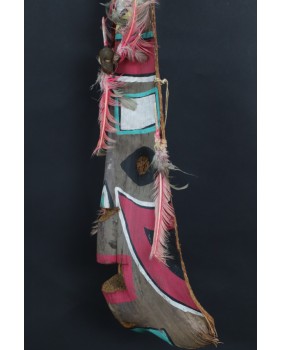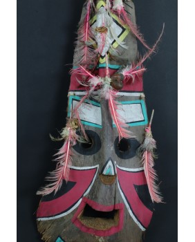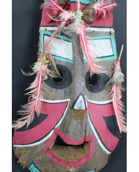 Maska, którą oferuję jest prawdopodobnie jedną z takich masek choć jej związek ze sztuką etniczną jest dużo wyraźniejszy. Ptasie pióra, suszone nasiona przypominają magiczne elementy z masek plemiennych mających nadać masce nadzwyczajną moc. Otwory na oczy sugerują, że mogłaby być używana w festiwalach nawiązujących do dawnych plemiennych ceremonii.