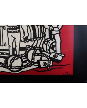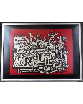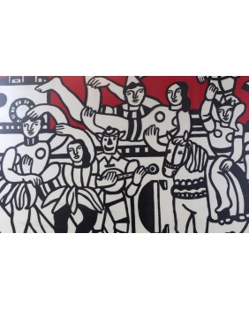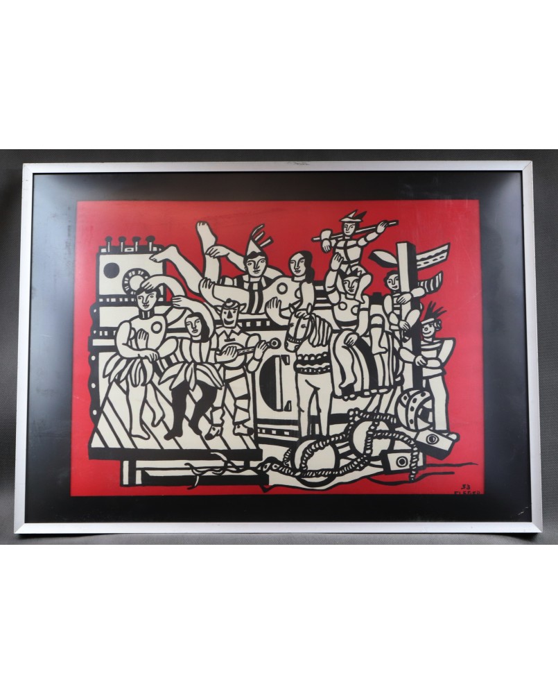 O samym artyście napisano już setki publikacji. Spróbuję więc jedynie przybliżyć oferowaną pracę. Wielka parada na czerwonym tle jest podsumowaniem twórczości artysty. Powstała w roku 1953, krótko przed jego śmiercią. Jest po trosze syntezą wszystkich poprzednich pomysłów Legera na to czym ma być sztuka i jej rola we współczesnym świecie. Leger był z przekonań komunistą a może ściślej mówiąc utopistą. Jego świat opisywała początkowo abstrakcja, potem kubizm, mechaniczny konstruktywizm i co ważne wszelkie środki zostały zastosowane aby dzieło sztuki uczynić zrozumiałym dla szerokiego kręgu odbiorców. Jego zbiorowy idol klasa robotnicza była przedstawiana przez niego w wielu momentach społecznego życia. Opisywał jej rozrywki, pracę, codzienność. Po II wojnie przychylniej zaczął spoglądać w kierunku klasycznej harmonii w estetyce swych prac. Miało to być symbolem odnowionej harmonii społecznej. Wielka Parada na Czerwonym Tle traktowana jest przez krytyków jako odzwierciedlenie artystycznych koncepcji Legera u schyłku jego życia.