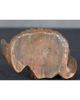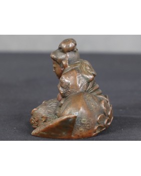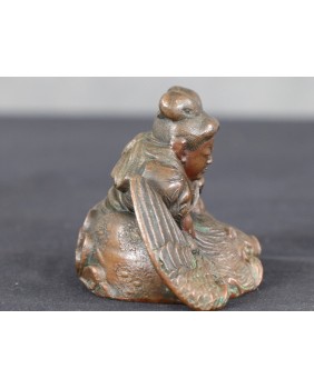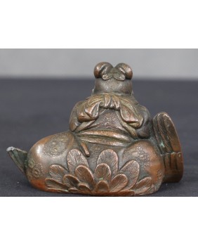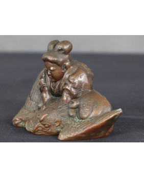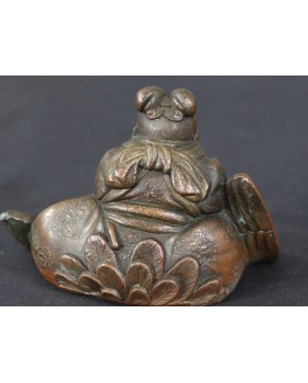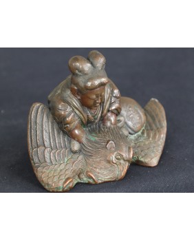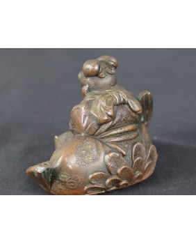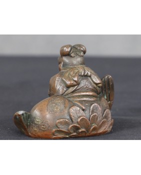 Niewielka rzeźba, którą proponuję pochodzi z okresu Meji (1868-1921), okresu w którym nastąpiła modernizacja Japonii, zakończyły się rządy szogunów. W sztuce pojawiły się wówczas przedmioty „metal mixed”, przywracające stare materiały w nieco innej odsłonie. Rzeźba jest wykonana z cyny i pokryta cieniutką powłoką z miedzianej blaszki.
