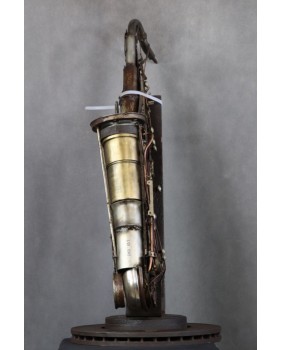 Podstawę wykonaną z fragmentu samochodowej tarczy hamulcowej kupiłem razem z rzeźbą choć jestem przekonany, że saksofon dużo lepiej wyglądałby na delikatniejszym statywie. Rzeźba na tym statywie stoi w miarę stabilnie, trytytki użyłem na potrzeby robienia fotografii.