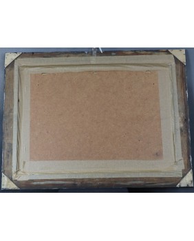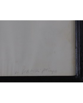 Grafika nie jest w idealnym stanie. Ma niewielkie zalanie w prawym dolnym rogu i widoczne na zdjęciach pofałdowania. Rama też pozostawia wiele do życzenia ale tak ją kupiłem na warszawskim Kole. Z ramą ma wymiar 64 na 83 cm. Sam papier to około 48 na 68 cm. Jest sygnowana.
