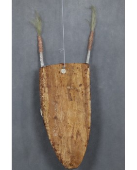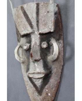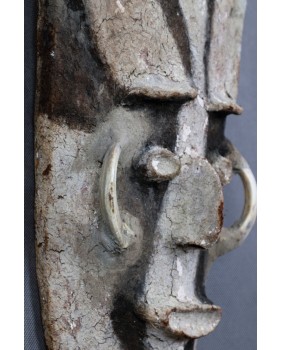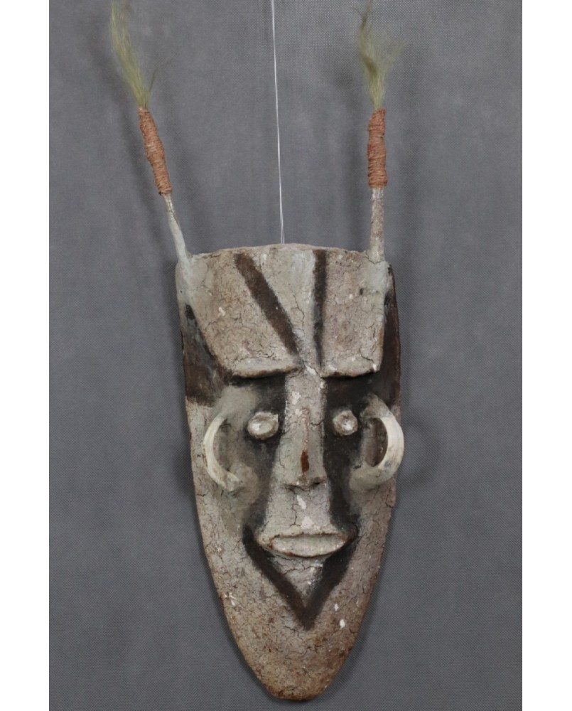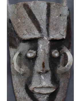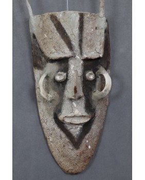 Powierzchnia maski modelowana jest masą roślinną i ozdobiona kłami dzikiej świni. Świadczy to o wysokiej randze tancerza noszącego maskę bo świnie były bardzo drogie. Maska pomalowana jest barwami klanu. Sądzę, że wypustki były naprawiane.