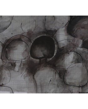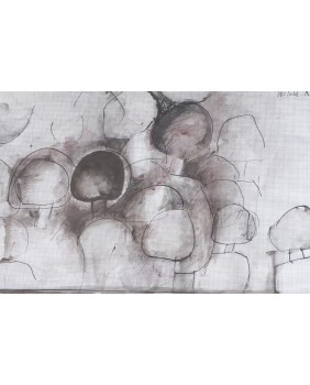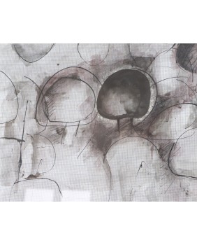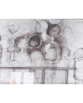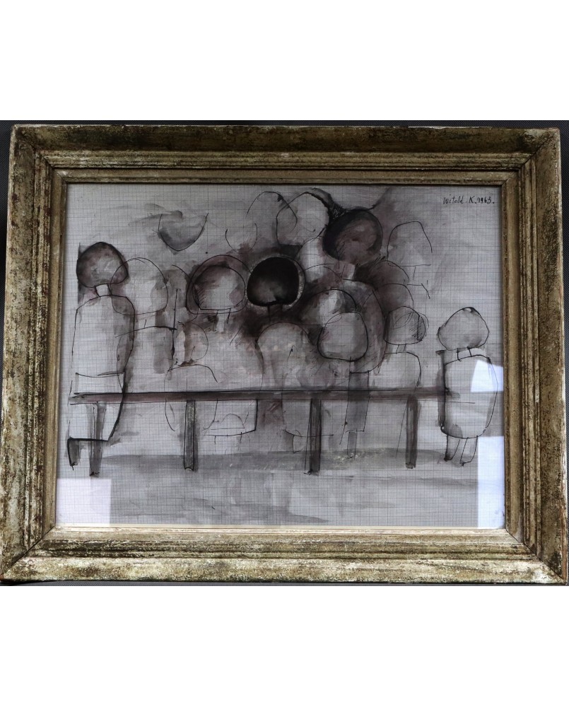 Pracę, którą oferuję kupiłem w Paryżu. Głupio się targując przegapiłem olejny obraz tego artysty. Piszę pracę bo nie do końca mam pewność czy jest to akwarela czy artysta użył jedynie tuszu. Być może rozlewające się medium sprawia, że kompozycja wypełnia cała płaszczyznę dzieła trochę odmiennie niż w większości prac tego artysty. Zamiast kartonu Witold K. bo tak się zwykle podpisuje, skorzystał z papieru milimetrowego. Wymiar z ramą 61 na 50 cm.