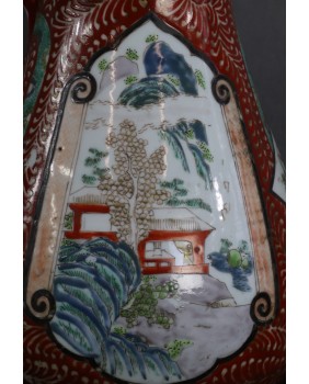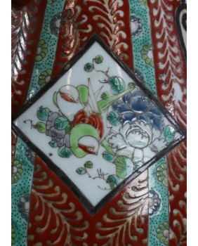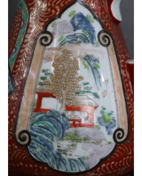 Oferowany dzban jest moim zdaniem przykładem porcelany produkowanej na eksport do Europy. Więcej nawet, jego nietypowy dla Japonii kształt powstał pod konkretne zamówienie, prawdopodobnie na podstawie dostarczonego wzoru. Na jednym z portali sprzedażowych spotkałem taki sam dzban oferowany ze spójną stylistycznie misą. Tworzyły typowy zestaw umywalkowy, popularny w Europie w XIX i na początku XX wieku. Dekoracje natomiast są typowo japońskie. Nawiązują do kameralnego, klasycznego stylu malarstwa japońskiego. Dzban jest w dobrym stanie poza dwoma niewielkimi uszczerbkami w okolicach wylewki.