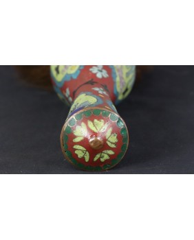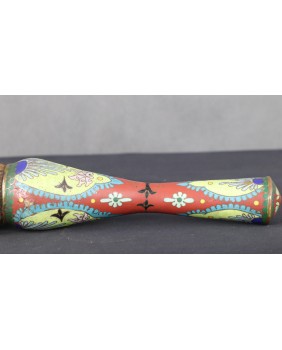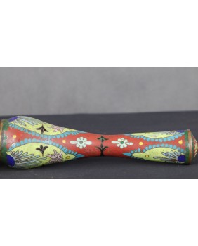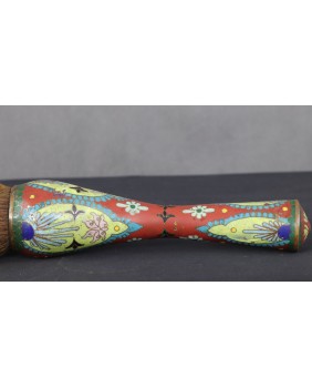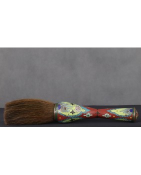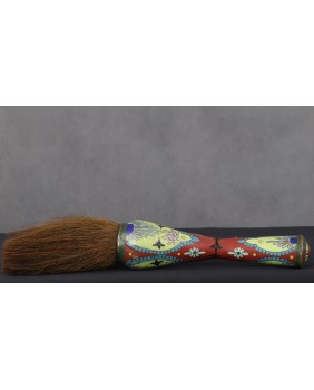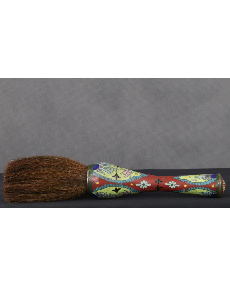 Pędzel, który oferuję ma oprawę z emalii komórkowej. Należy do dużych pędzli w zestawie. Mógł powstać pod koniec XIX wieku lub na początku XX. Poza kilkoma niewielkimi ubytkami emalii jest w dobrym stanie. Łącznie z włosiem ma 37 cm długości. Sama rączka ma 24 cm długości. Szerokość najgrubszego miejsca rączki wynosi 7 cm szerokości.