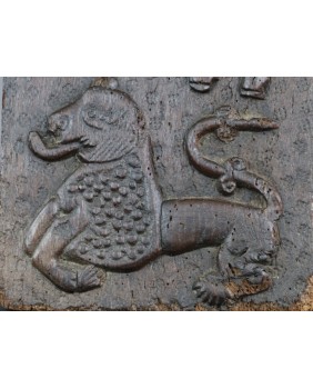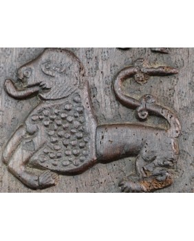 Także temat rzeźby pozostaje zagadką. Lew i koń jest łatwo rozpoznawalny, przy czym lew przedstawiony jest w bardzo archaicznej formie. Pytania budzi ukazana w dziwnym anatomicznie ruchu postać. Być może jest to anioł.