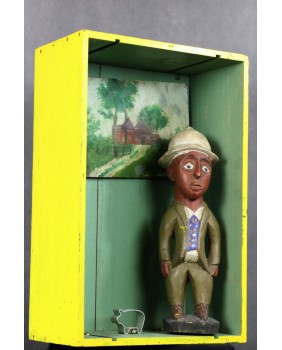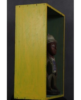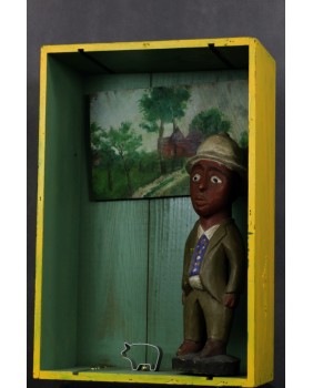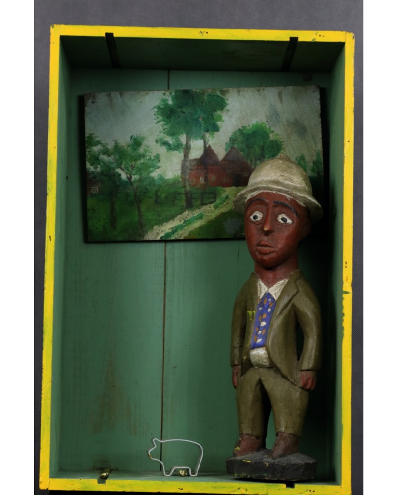 Kolejna rzeźba kolonialna w moim sklepie. Choć stwierdzenie rzeźba jest mało precyzyjne. Bardziej na miejscu byłoby powiedzieć diorama czy instalacja. Nie do końca rozumiem znaczenie stworzonej sceny. Zagadką pozostaje dla mnie wygięta z paska blachy sylwetka świni czy typowo europejski landszaft wiszący na ścianie. Artysta, snuje sobie znaną opowieść, która dla mnie pozostanie tajemnicą. Jedyny znany mi element to postać czarnego mężczyzny w europejskim stroju i korkowym hełmie. To typowa rzeźba społeczności Baule z Wybrzeża Kości Słoniowej.