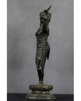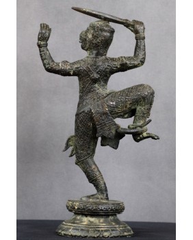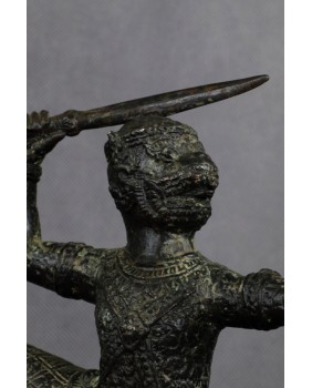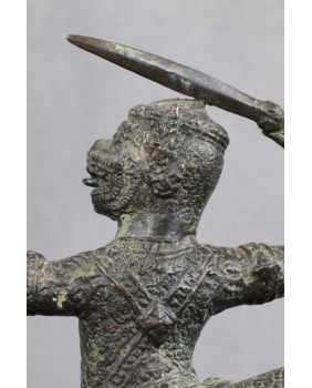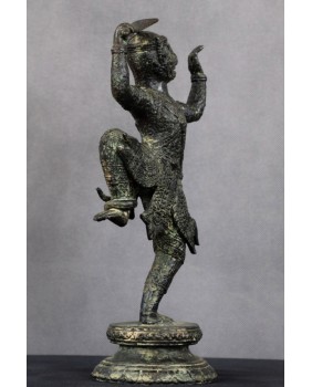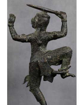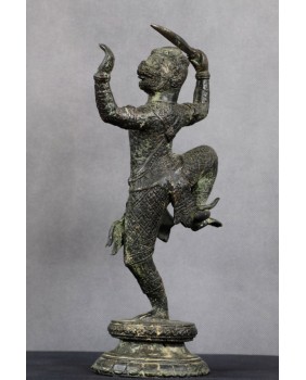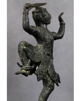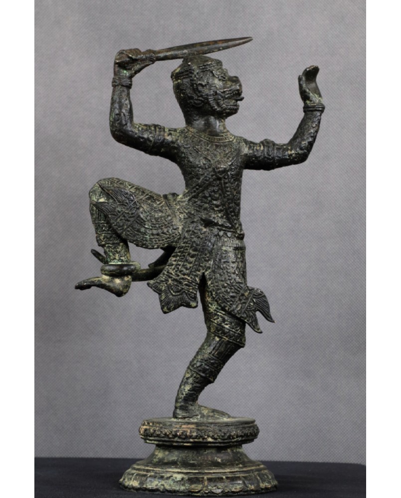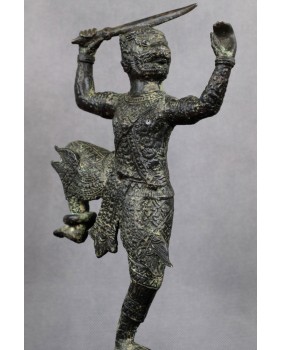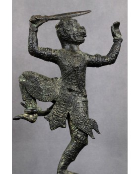Przy identyfikacji tej rzeźby miałem okazję skorzystać z zasobów sztucznej inteligencji, która umiejscowiła rzeźbę w Azji południowo-wschodniej i stylistycznie przypisała do sztuki Khmerów z XIX wieku. Identyfikację potwierdziły inne wyszukiwarki dostępne w internecie. Osobiście też jestem przekonany do tej weryfikacji. Rzeźba jest na pewno stara, ma dobre patyny, charakterystyczny dla starych brązów jest sposób łączenia figury z jej podstawą a bardzo bogate ornamenty stroju Hanumana, dynamiczna poza herosa pozwalają bez wątpliwości przypisać rzeźbę do sztuki Khmerów.