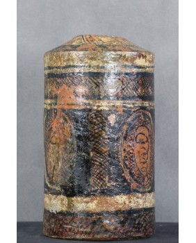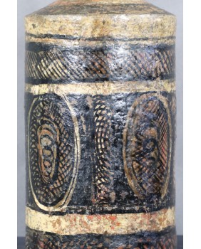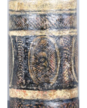 Naczynie ma 32 cm wysokości i 18 cm średnicy. Poza ubytkami malatury pojemnik jest w dobrym stanie, bez pęknięć.