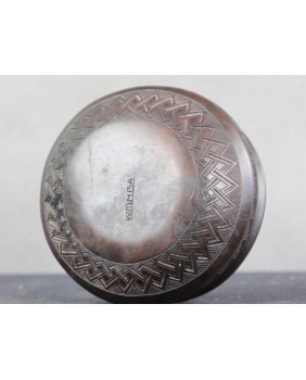 Skusił mnie też napis na dnie miseczki. Pojawiła się nadzieja, że w ten sposób łatwo zlokalizuję miejsce powstania przedmiotu. Miałem niestety pecha. Kotemba to tylko imię afrykańskiego jak sądzę artysty. Środki użyte w dekoracji miseczki są najprostsze z możliwych, takie, które pojawiają się w wielu kulturach świata. Wydaje się że wzór na naczyniu jest inspirowany sztuką islamu a ten jest w Afryce powszechnie obecny,