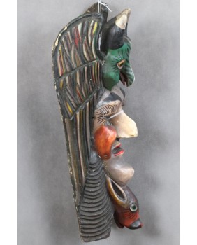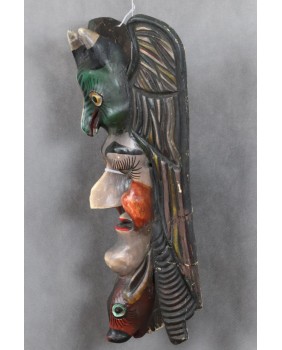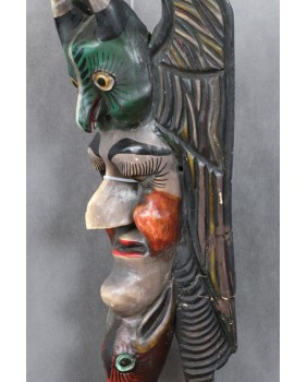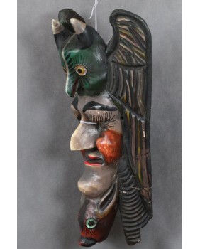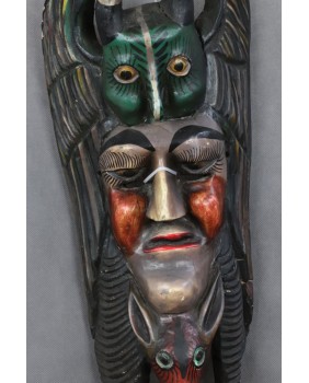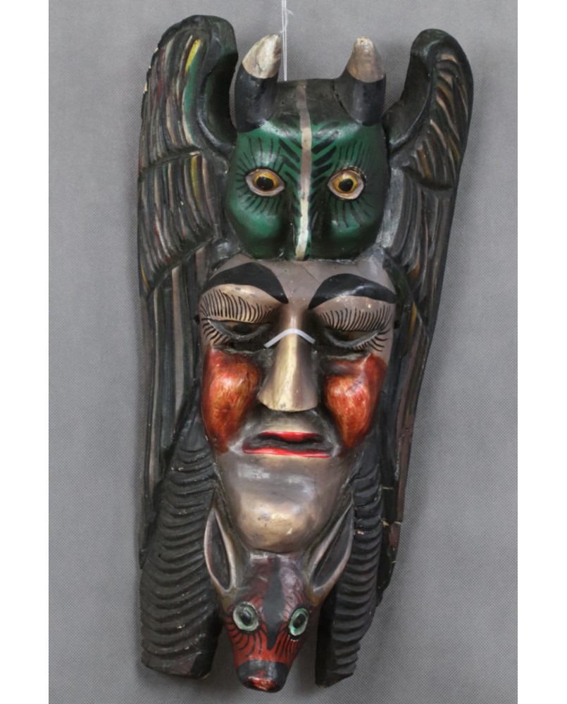 Maska odbiega stylem i kolorystyką od masek gwatemalskich dlatego przypisałem jej meksykańskie pochodzenie. Spotkałem kilka tych masek na portalach sprzedażowych nikt z wystawiających nie pokusił się niestety aby je nazwać i opisać.