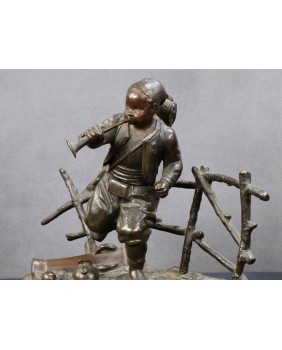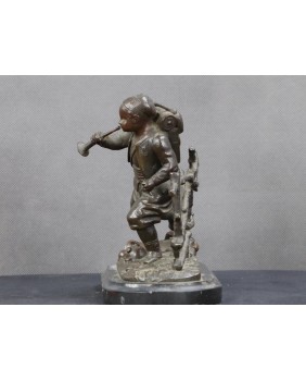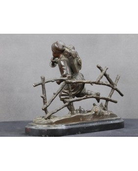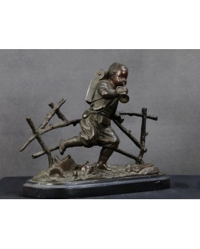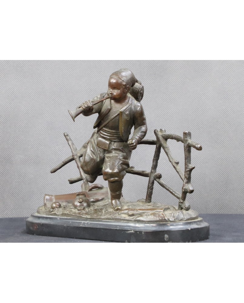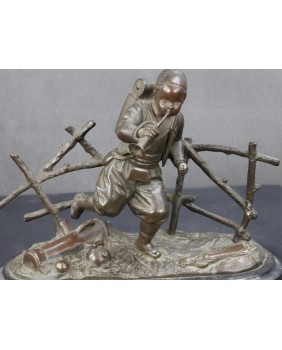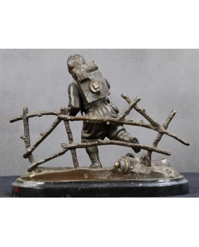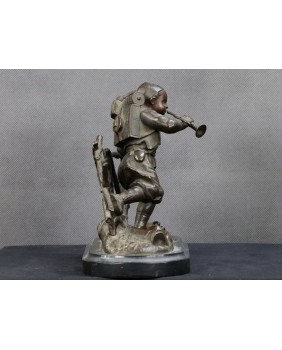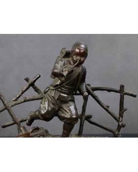 Militaria nie są moją mocną stroną ale przypuszczam, że rzeźba przedstawia chłopca pełniącego zaszczytną funkcję trębacza francuskich wojsk kolonialnych. Sygnał trąbki na polu bitwy był sposobem przekazywania rozkazów. Egzotyczna uroda chłopca, wschodni ubiór miały podkreślać atrakcyjność rzeźby. W efekcie mamy tu rzecz bardziej przypominającą sielankę niż obraz pola bitwy mimo atrybutów w postaci armaty, zasieków i bomb.
