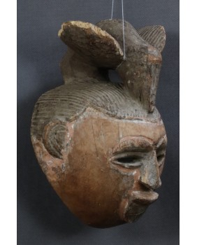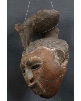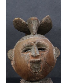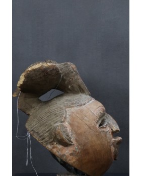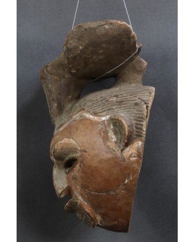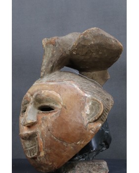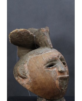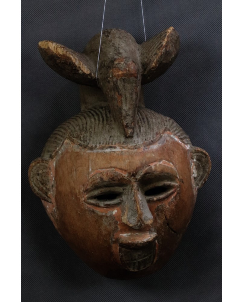 Maska, którą oferuję zachowała się w niezłym stanie. Ma jedynie nieduże ubytki drewna na fryzurze. Polichromia jak w zdecydowanej większości masek Punu pozostała jedynie w zakamarkach. Ma 28 cm wysokości, 22 cm szerokości i 17 cm głębokości.