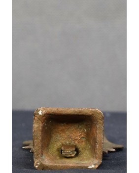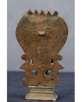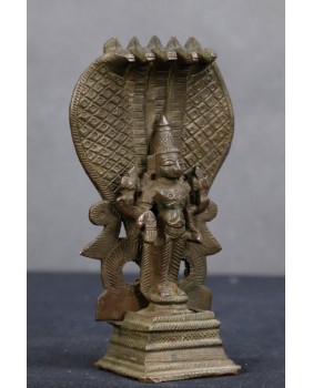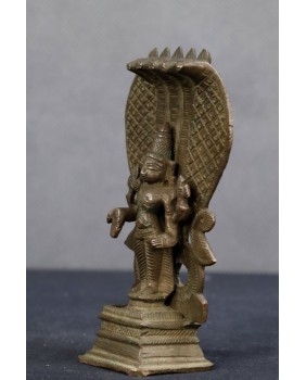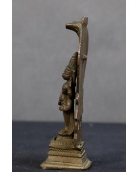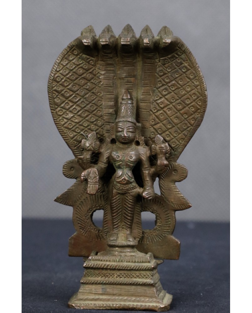 Figurka, którą oferuję to najbardziej popularne przedstawienie Wisznu. Jak sądzę ma kilkadziesiąt lat i jest to niestety przykład komercyjnej produkcji, mającej zaspokoić olbrzymi popyt Hindusów na własnego boga w domowym zaciszu. Jest odlana z dwóch części, jakość odlewu nie jest oszałamiająca.