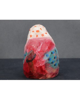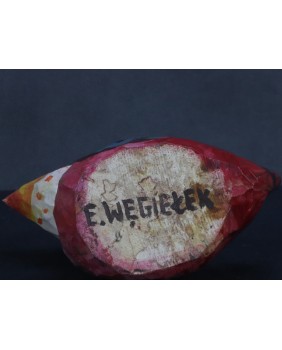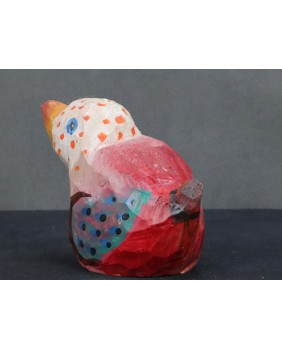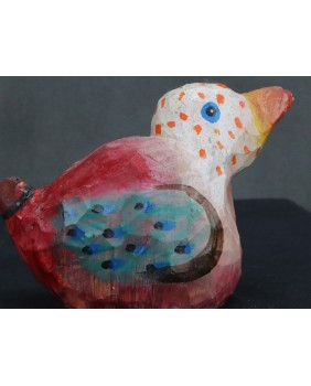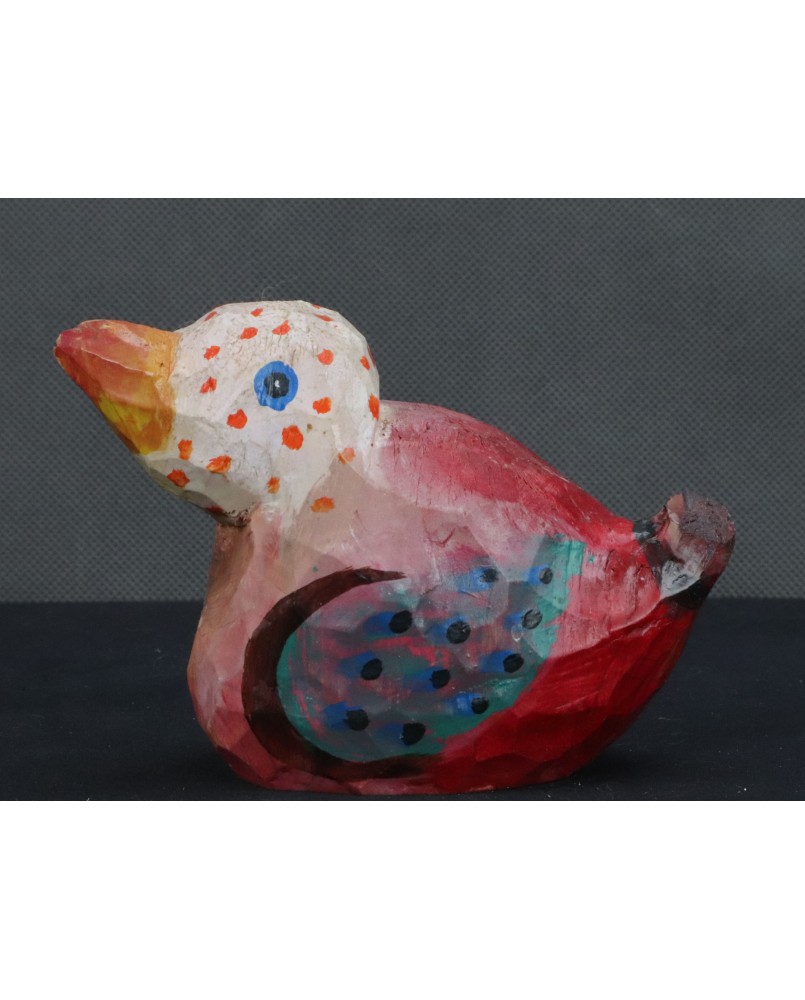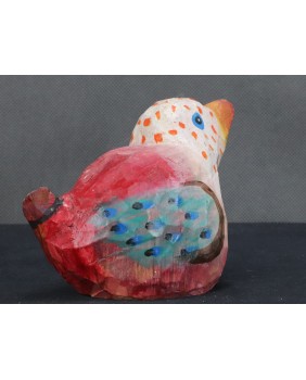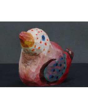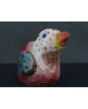 Ptaka dostałem od znajomej kolekcjonerki sztuki nieprofesjonalnej. Ona kupiła go bezpośrednio od twórcy. Ptaszysko zwróciło moją uwagę kolorystyką.Radosnym różowym kolorem łączonym z wszelkiej maści kropkami.