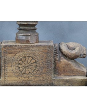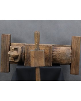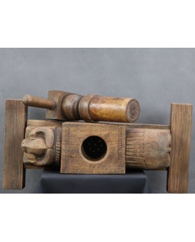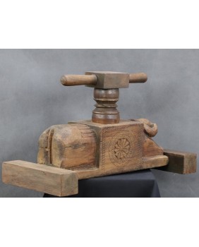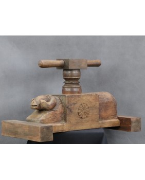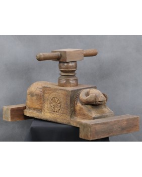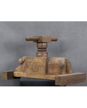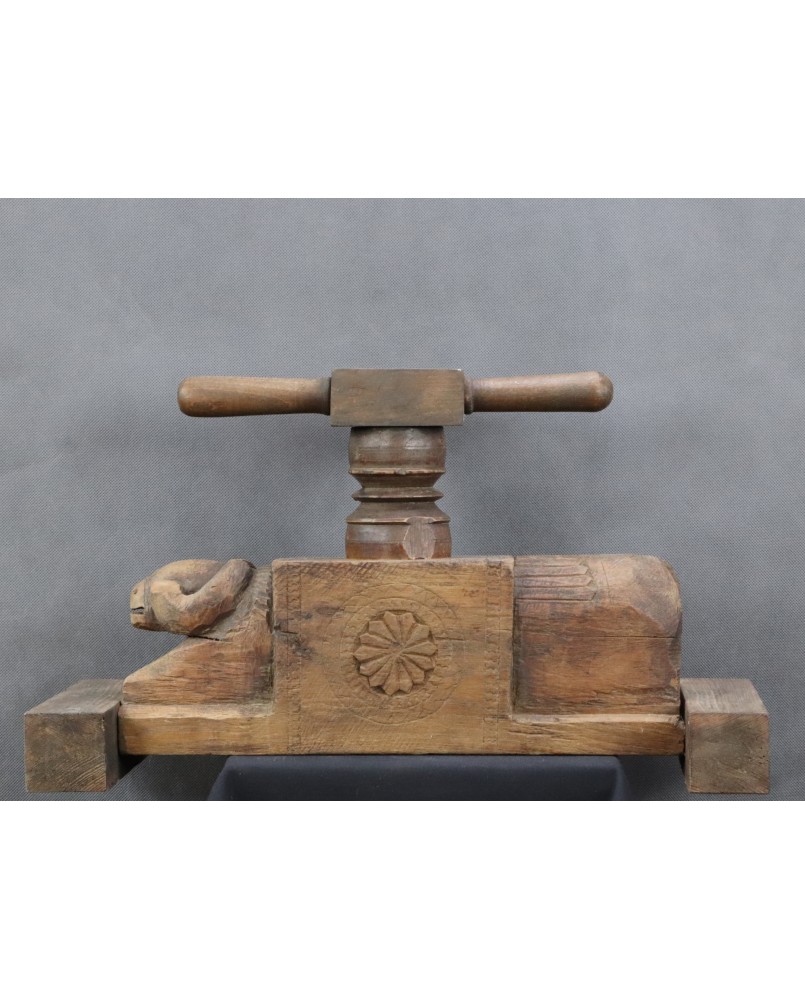 Jednak wyszukiwarka Google jasno pokazuje, że prasa pochodzi z Indii i przeznaczona jest do wyciskania soku z owoców. Najczęściej jako region powstania wymieniana jest północ tego olbrzymiego kraju. Zwykle, podobnie jak w tej, którą oferuję, prasy zdobione są głowami, bądź sylwetkami zwierząt. Najczęściej bardzo prymitywnie wyrzeźbionymi.