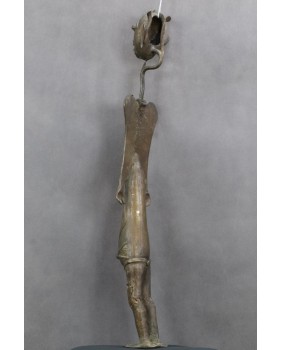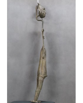 Rzeźba, którą oferuję nawiązuje do sztuki plemiennej. Niekoniecznie do sztuki wywodzącej się z jednej konkretnej grupy etnicznej. To raczej ogólna idea, wykorzystująca elementy „art tribal”. Postać jest wydłużona, zdeformowana, tułów przypomina wojenną tarczę, głowę zastępuje maska umieszczona na wysięgniku. Wzory pokrywające sylwetkę mogą sugerować plemienne skaryfikacje i tatuaże.