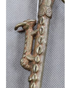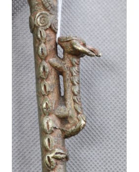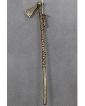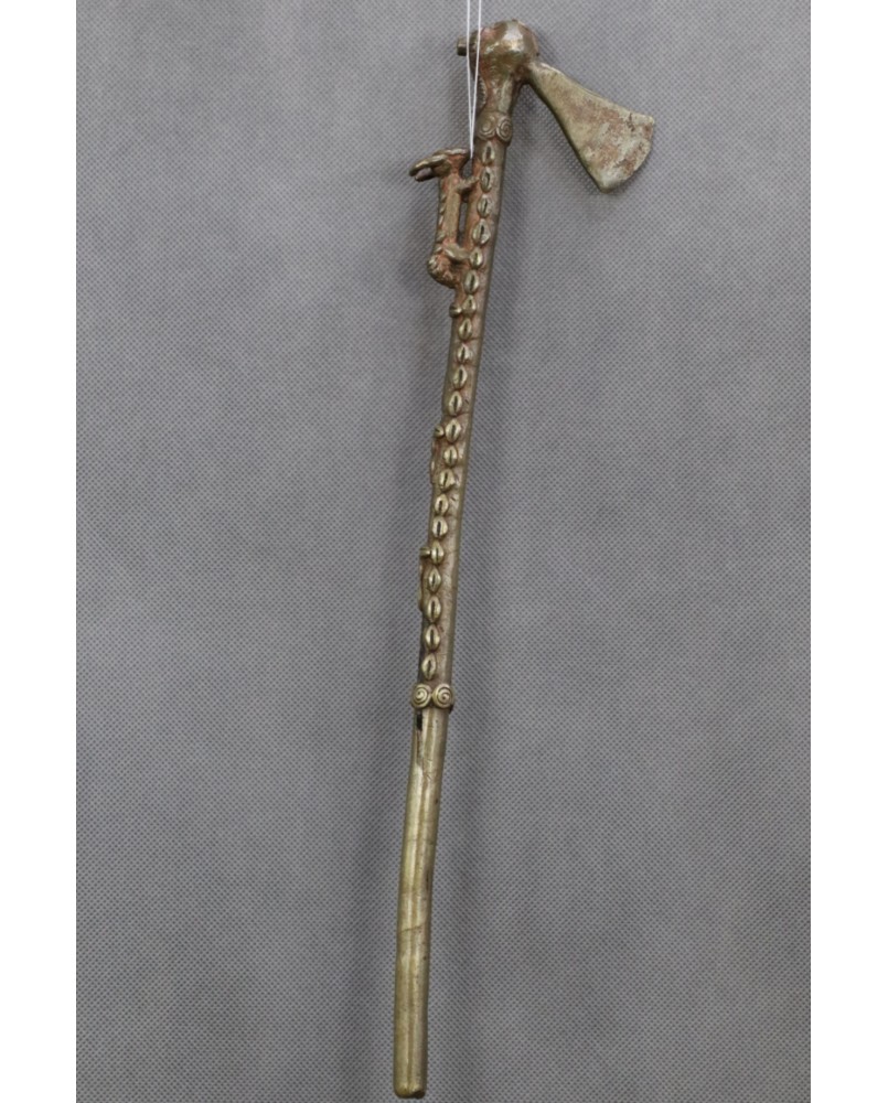 Nie sądzę żeby toporek był stary czy brał kiedykolwiek udział w ceremoniach plemiennych. Natomiast faktem jest, że powstał według starych wzorów. Odlany został metodą na wosk tracony, ozdobiony uroczym zdeformowanym zwierzakiem, żywcem przeniesionym, niemal jeden do jednego z benińskich pałacowych brązów.