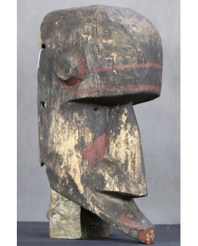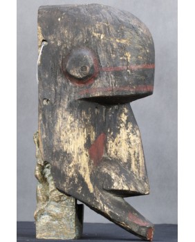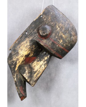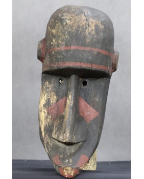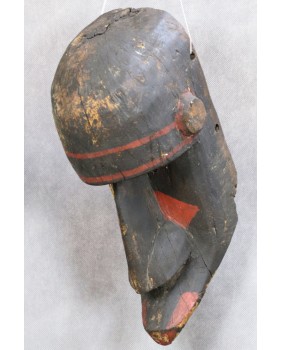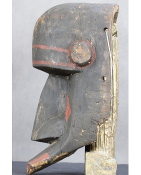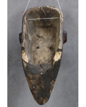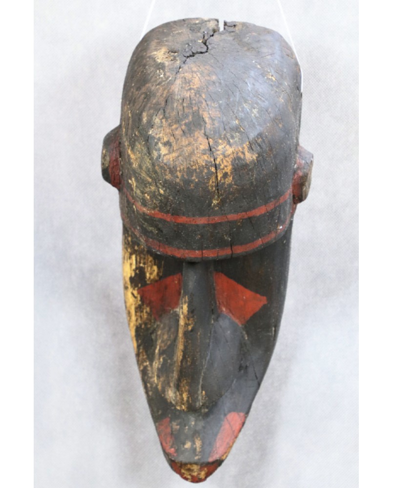 Maska jest niewątpliwie stara. Kupiłem ją we Francji wraz z kilkoma innymi, które wydawały się być częścią świadomie tworzonej kolekcji. Maska ma dwa nieduże ubytki drewna i spore braki w polichromii.