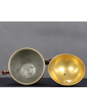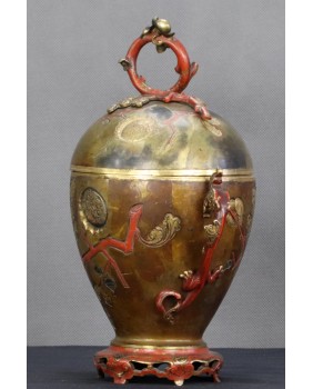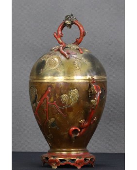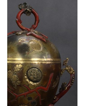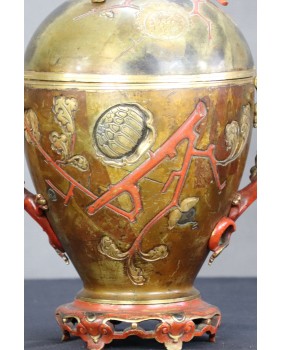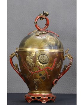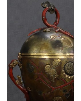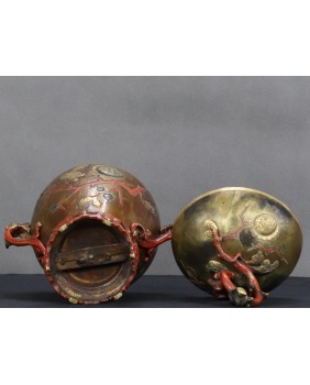 Japońskie naczynia użytkowe zadziwiły Europejczyków, precyzją wykonania i dekoracyjnością, kiedy pod koniec XIX wieku zaczęły liczniej pojawiać się na kontynencie. Podstawowy model wykonany z brązu zdobiono najczęściej techniką intarsji z wykorzystaniem stopów miedzi, srebra czasem złota. Mieszano te metale w różnych proporcjach aby uzyskać zamierzone efekty kolorystyczne. Na wazonach, pojemnikach, kadzielnicach pojawiały się motywy florystyczne czasem sięgano do japońskiej mitologii. W tym konkretnym przypadku mamy uchwyty w formie pięknych, stylizowanych smoków i zgeometryzowany motyw gałązek wiśni.